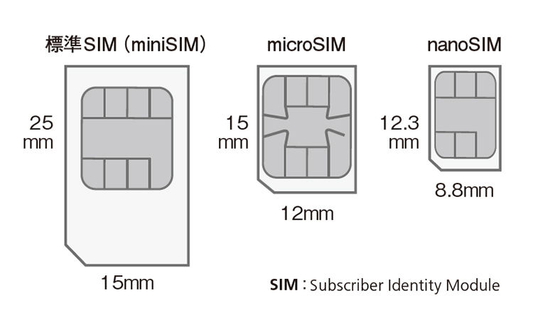 ソフトバンクは2010年、iPhone 4と同時に、縦15mm、横12mmの「microSIM」の提供を開始。2012年には、KDDIとソフトバンクがiPhone 5とともに「nanoSIM」を提供している。nanoSIMのサイズは縦12.3mm、横8.8mm。現在では、Androidを含め多くのスマートフォンがnanoSIMに対応している。